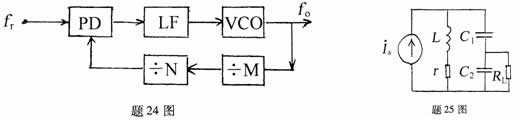 24.(本题5分)图示锁相频率合成器,输入参考频率fr=25kHz,前置固定分频器M=10,输出频率范围为9~10MHz,求